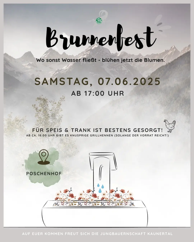 Die Jungbauern Kaunertal laden am 7. Juni 2025 ab 17:00 Uhr herzlich zur Einweihung des neu sanierten Brunnens in Nufels/Poschenhof mit anschließendem Fest ein.