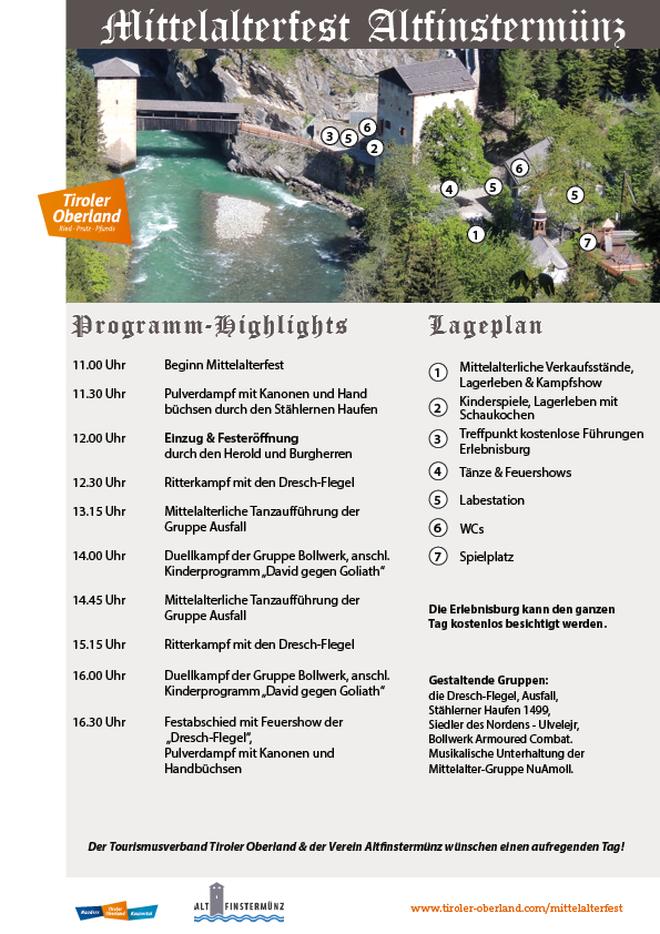 Altfinstermünz ist eine mittelalterliche Gerichtsstätte und Grenzbefestigung an der historischen Römerstraße Via Claudia Augusta. Die in den vergangenen Jahren aufwändig restaurierte Anlage begeistert durch ihre Bauweise und das noch heute spürbare, besondere Ambiente der damaligen Zeit. Eine Faszination, die alle Besucher des Mittelalterfestes in Altfinstermünz in ihren Bann zieht. Prinzen und Prinzessinnen, Ritter und Hofdamen, Gaukler und Narren – beim historischen Spektakulum fehlt es an nichts. Unter den Augen der Majestäten präsentieren die Künstler ihre Darbietungen und mittelalterliche Kämpfer ihr Können.