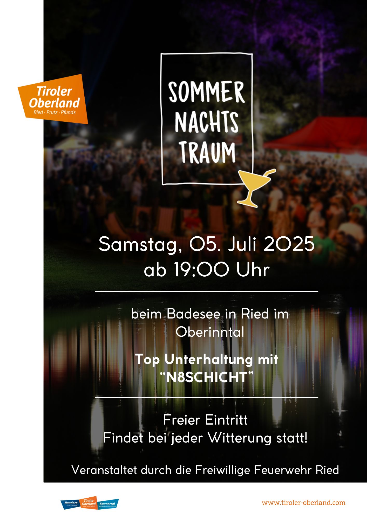 Der 12. Sommernachtstraum am Badesee in Ried findet wieder am 05. Juli 2025 statt. Veranstaltet wird dieses Fest diesmal von der Feuerwehr Ried