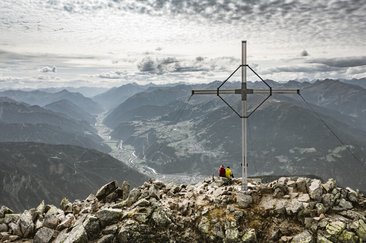 Die folgenden 230 hm sind felsiger und steiler. Auf diesem Wegstück kann man gelegentlich eine Hand zum Festhalten gebrauchen. Am großen Gipfelkreuz der Hohen Aifner Spitze angekommen, bietet sich in alle Richtungen eine wirklich grandiose Aussicht, für die man unbedingt etwas Zeit einplanen sollte!