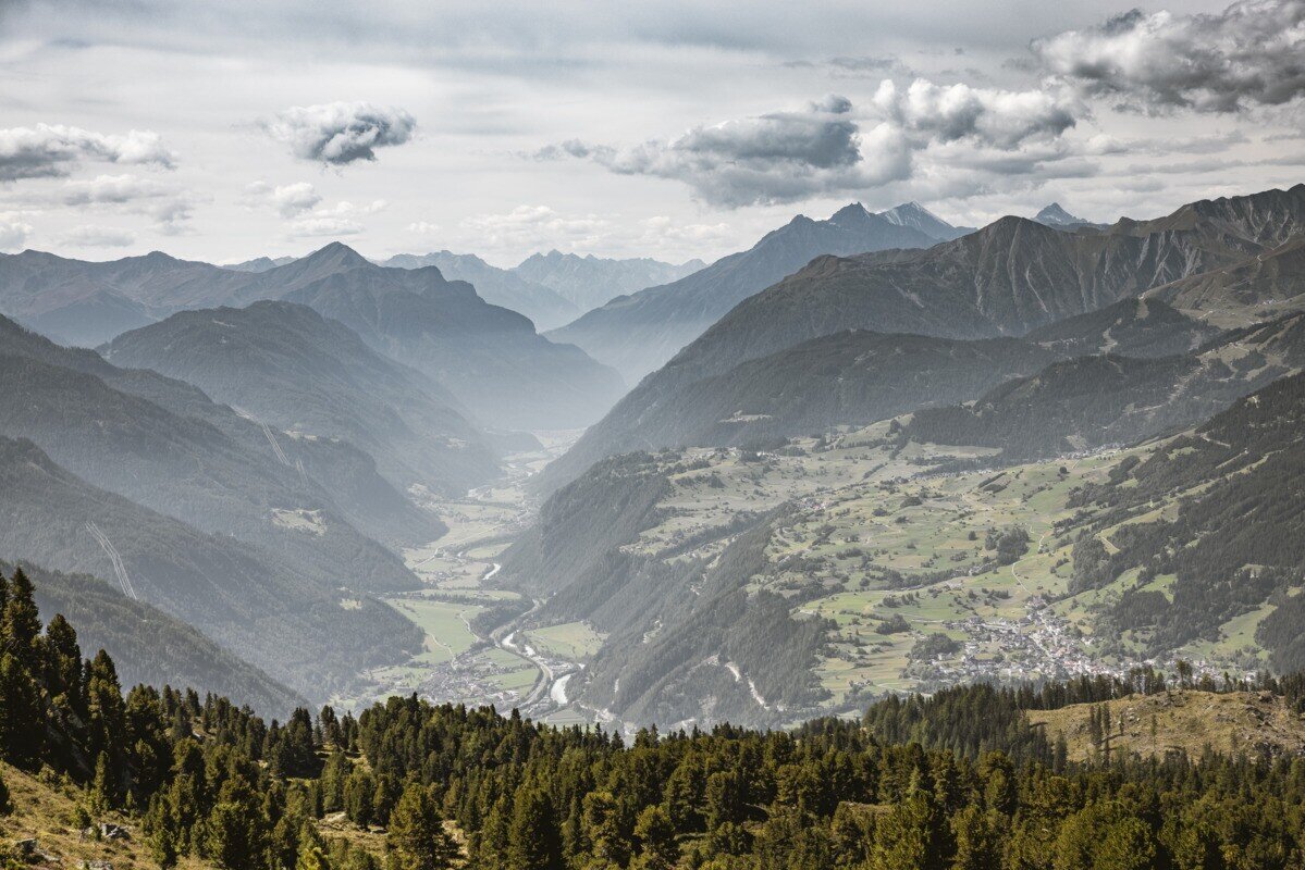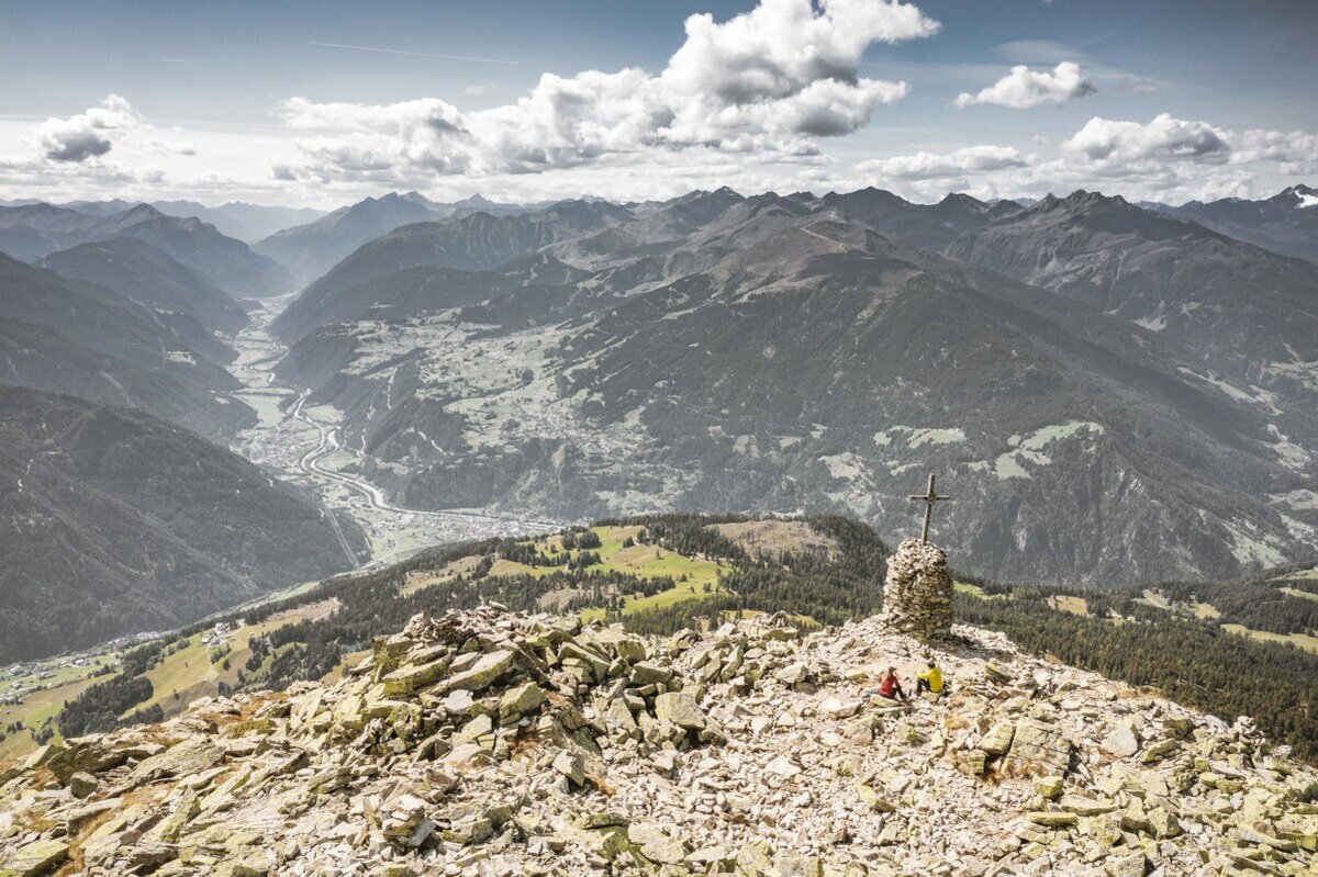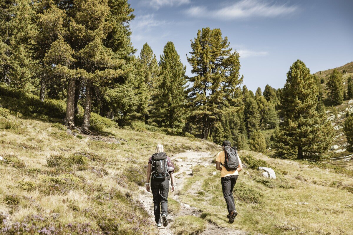 Man wandert direkt am Almgebäude vorbei und steigt über wunderschöne, von Zirben umringte Weideböden bergwärts. In angenehmer Steigung verläuft der gut markierte Weg über die Waldgrenze hinaus und folgt dann einem breiten Rücken. Hier erreicht man einen Wegweiser und folgt diesem in südlicher Richtung zur Aifner Spitze (2.558 m) hinauf. Am kleinen Kreuz, das sich auf einem großem Steinsockel befindet, bietet sich eine wunderschöne Fernsicht ins Kaunertal, sowie über das Inntal hinweg bis in die Schweiz hinein.