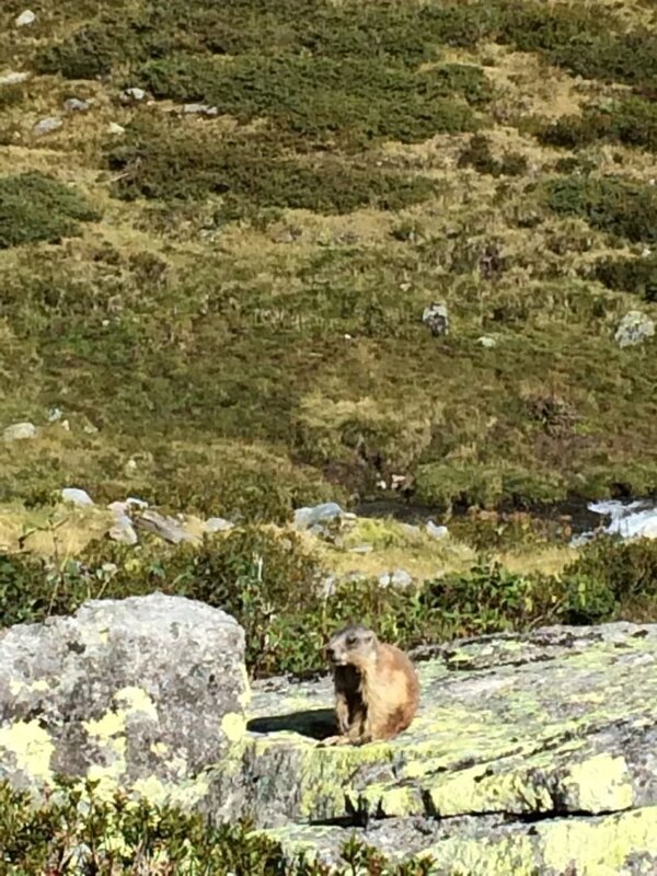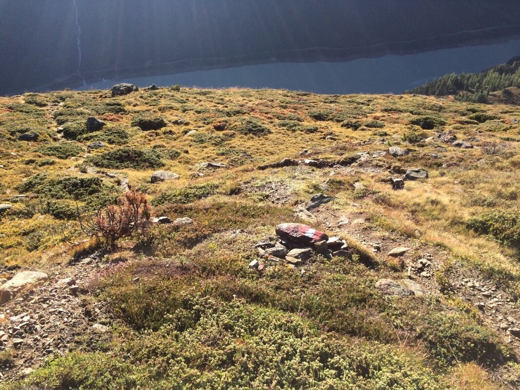Dort wo der Karrenweg endet, führt ein Steig weiter, dessen Verlauf immer wieder rot-weiß markiert ist. Gelegentlich weisen auch Steinmänner den Weg. Der Steig führt nun etwas steiler bergauf, dafür gewinnt man wieder schnell an Höhe und erreicht auf 2.480 m die „Hochgampe“. Hier wird der Wegverlauf wieder flacher und dreht nun nach Westen. Mit wunderschönem Blick in das Kaiserbergtal wandert man, entlang einer annähernd flachen Geländestufe - den „Steinböden“. Gämsen, Murmeltiere, aber auch Steinböcke können hier mit etwas Glück erspäht werden. Einzelne Wegpassagen führen jetzt durch Steinfelder, wobei man aufmerksam auf die nächsten Markierungen achten sollte um den Wegverlauf nicht aus den Augen zu verlieren. In Gehrichtung ist eine schwarze Felswand bereits zu sehen, der See unterhalb bleibt aber noch versteckt. Ist der letzte Bach erreicht, folgt man diesem etwas aufwärts und wechselt bei den Markierungen auf 2.600 m Seehöhe die Bachseite. Der Steig quert nun die Hangseite Richtung Westen. Der herrlich gelegene Bergsee, ein verstecktes Kleinod, zeigt sich erst ganz zum Schluss.