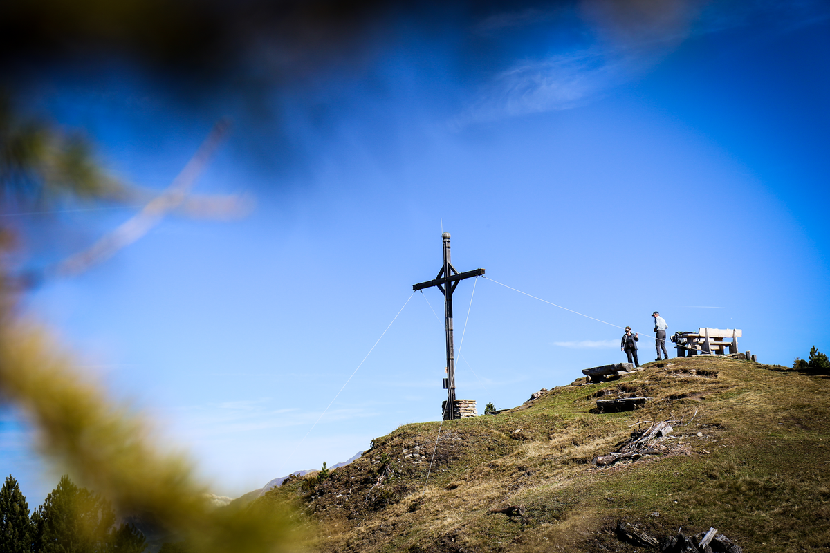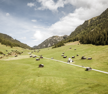 Bergsommer von seiner schönsten Seite - mit der Blumenpracht in der Tschey. Die vielfältige Alpenflora erreicht von Juni bis Juli ihren Höhepunkt, bei Blumenliebhabern ist vor allem das artenreiche Orchideenvorkommen bekannt. Im August werden die Wiesen gemäht - auf den Wiesen herrscht reges Treiben. Das Hochtal ist der ideale Ausgangpunkt für eine Almenwanderung Richtung Platzer Alm und Gschnair Alm oder für eine Wanderung auf den Hausberg von Pfunds den Frudiger.