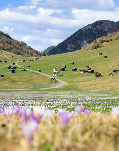 Im Frühling erwacht die Natur und die grünen Wiesen sind mit tausenden violetten und weißen Krokusse übersäht.