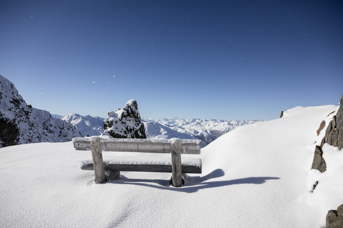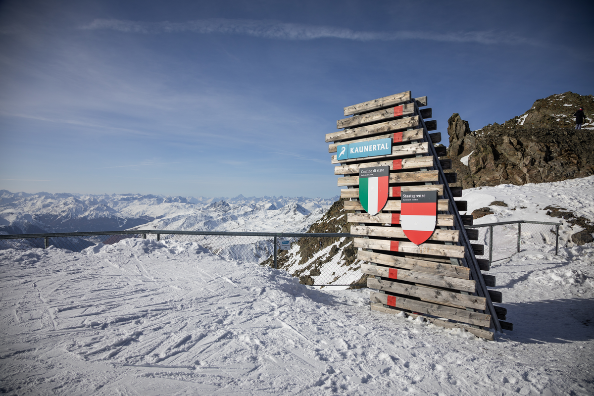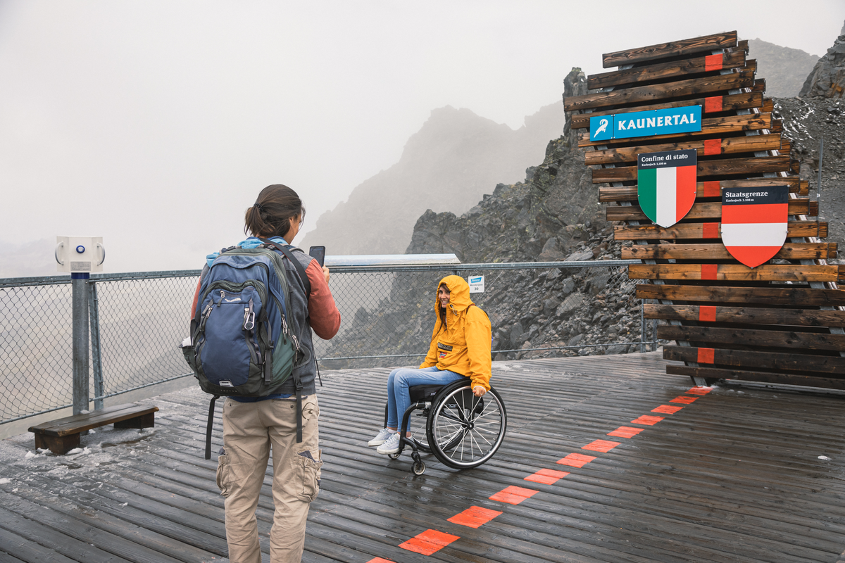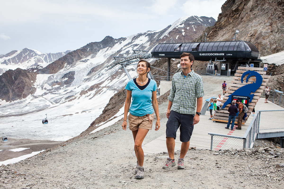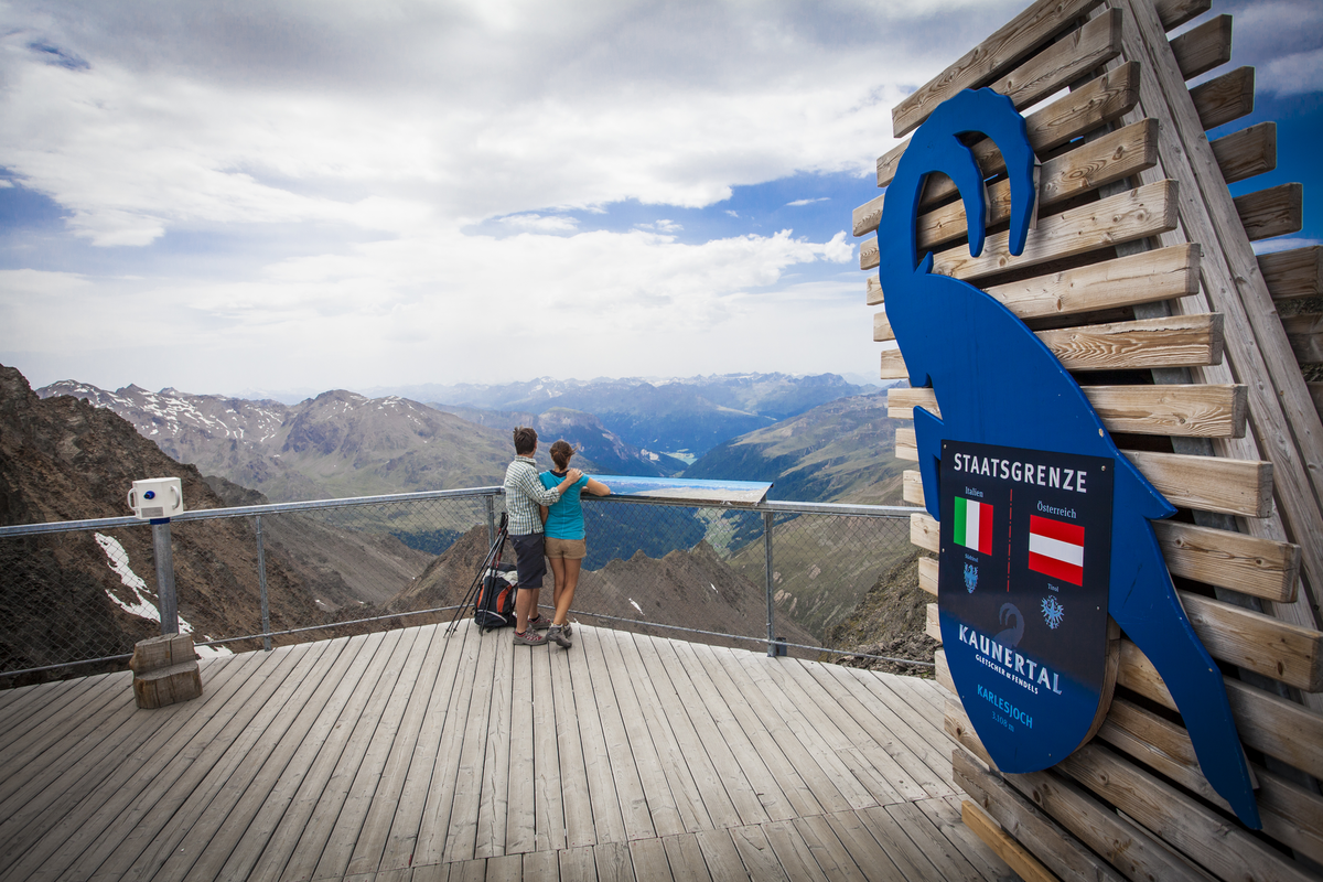 Die Aussichtsplattform am Dreiländerblick macht ihrem Namen alle Ehre. Ganz bequem und vor allem barrierefrei kann man am Kaunertaler Gletscher bis über 3.000 Meter gondeln! Man steht an der Staatsgrenze zu Italien mit der Aussicht auf die höchsten Gipfel Österreichs, Italiens und der Schweiz. Das Bergpanorama, das sich hier oben dem Besucher eröffnet, zählt zu den besten Panoramen der Alpen. Mitten durch die Plattform des Karlesjochs zieht sich die Staatsgrenze und so kann man gleichzietig mit einem Fuß in Österreich und mit einem Fuß in Italien stehen.