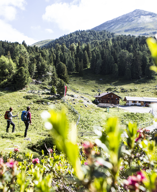 Die urige Almhütte (1.980 m) liegt am Dr.-Angerer- Höhenweg zwischen Falkauns- und Verpeilalm, kann über den Wanderweg bestiegen werden oder man wandert durch einen ca. 1 km langen Bewässerungsstollen zur Alm.
