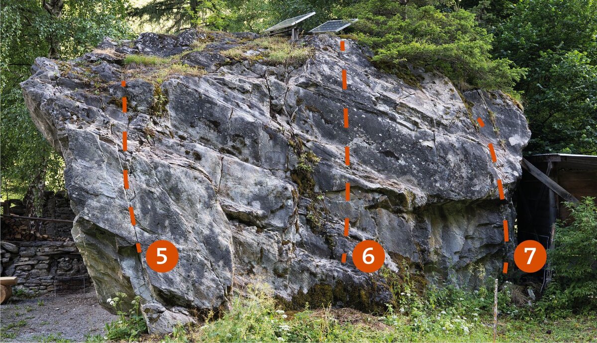 Bei diesem Block sind 7 Boulderprobleme mit einer Schwierigkeit von 4a bis 7a+ zu bewältigen.