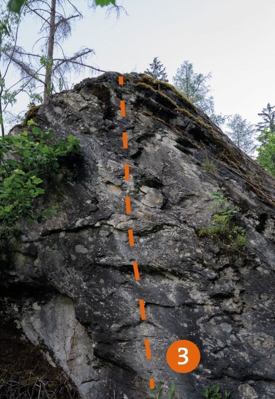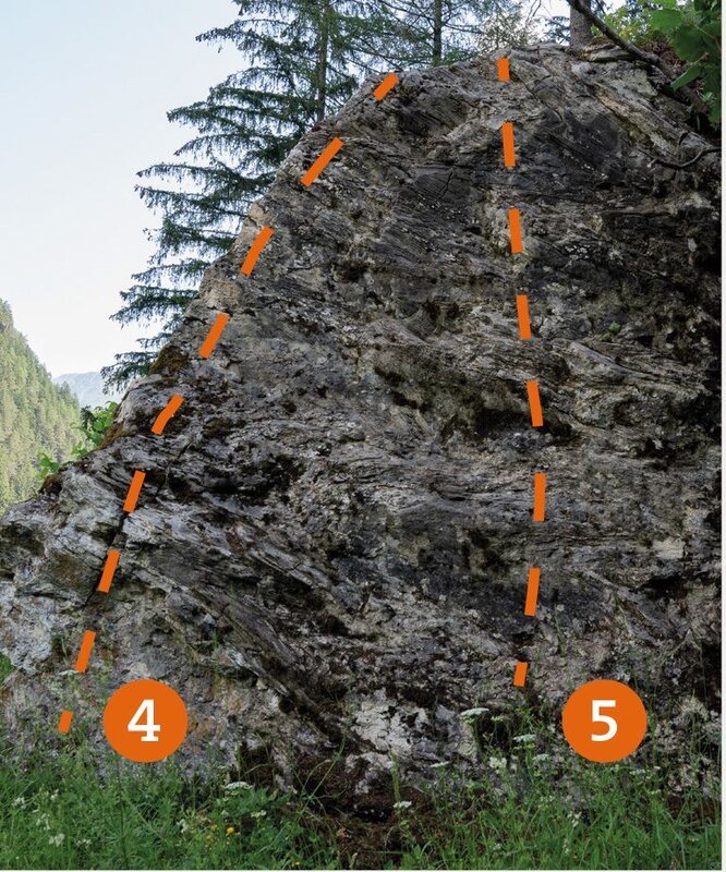 Bei diesem Block sind 5 Boulderprobleme mit einer Schwierigkeit von 4b bis 6a zu bewältigen.