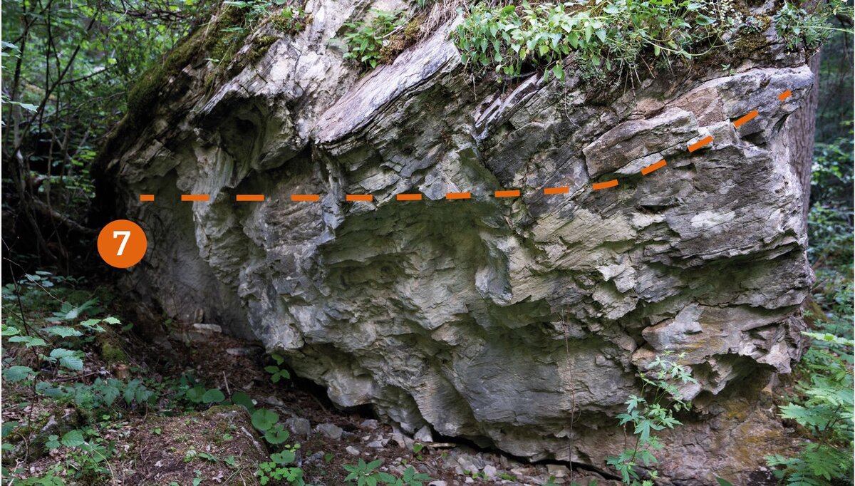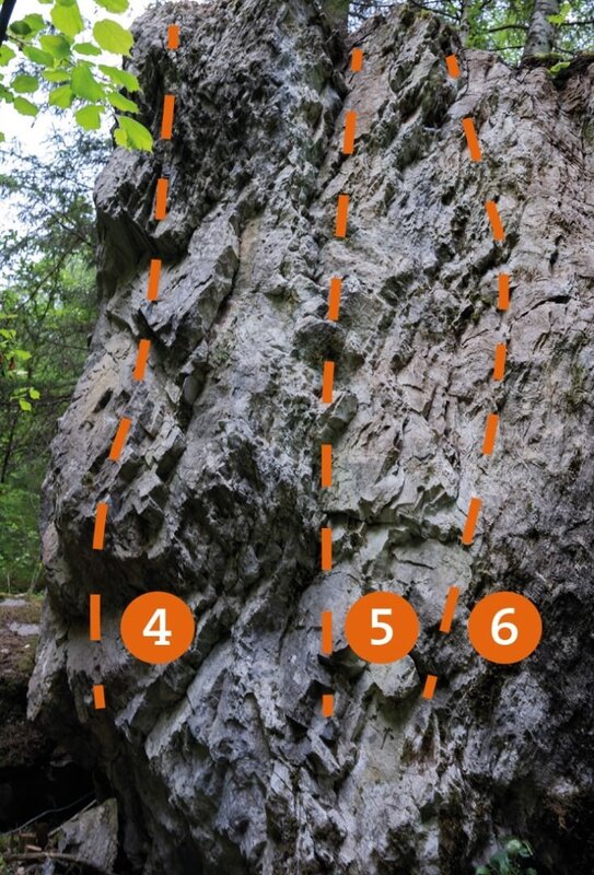 Bei diesem Block sind 7 Boulderprobleme mit einer Schwierigkeit von 4c bis 6c zu bewältigen.