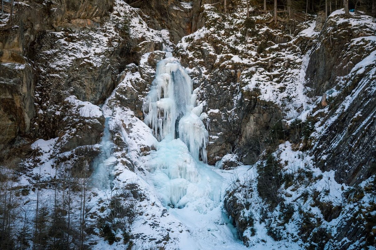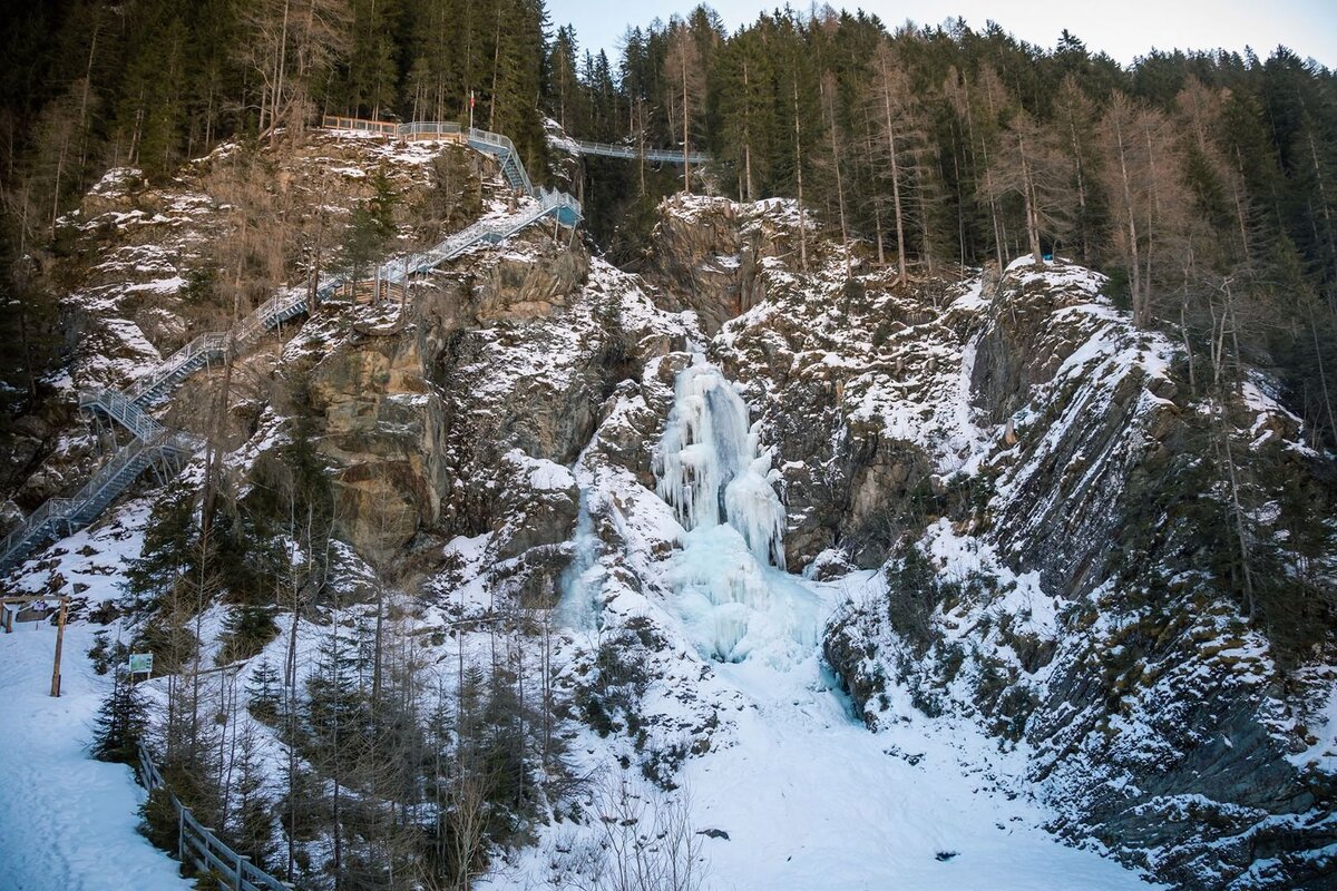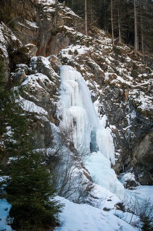 Herrlicher Übungswasserfall, nur wenige Minuten vom Dorfzentrum Feichten gelegen, ermöglicht auch bei widrigsten Schnee oder Lawinenverhältnissen ein wenig zu Pickeln.
