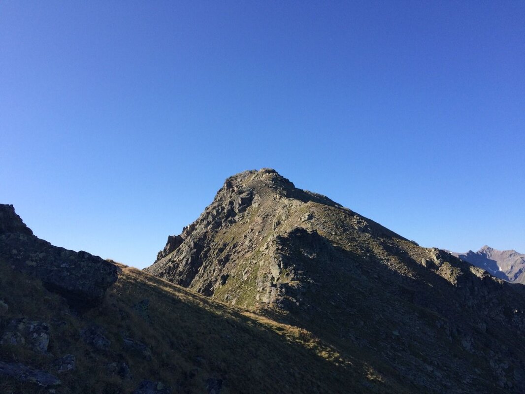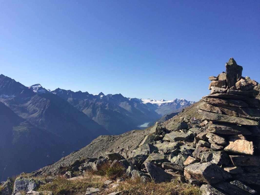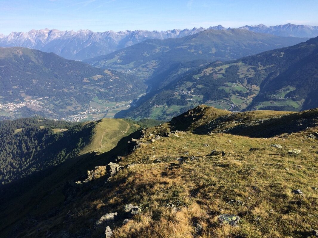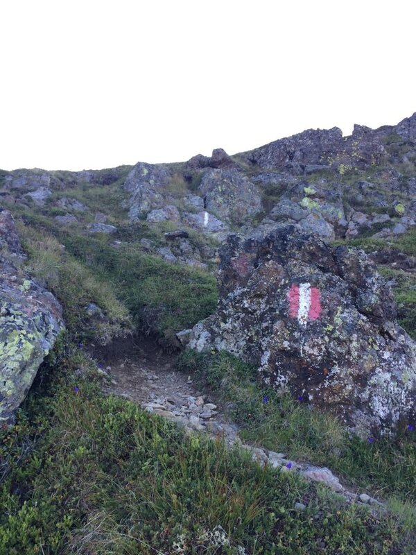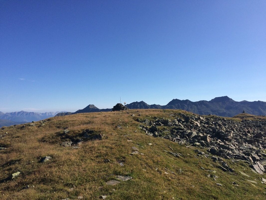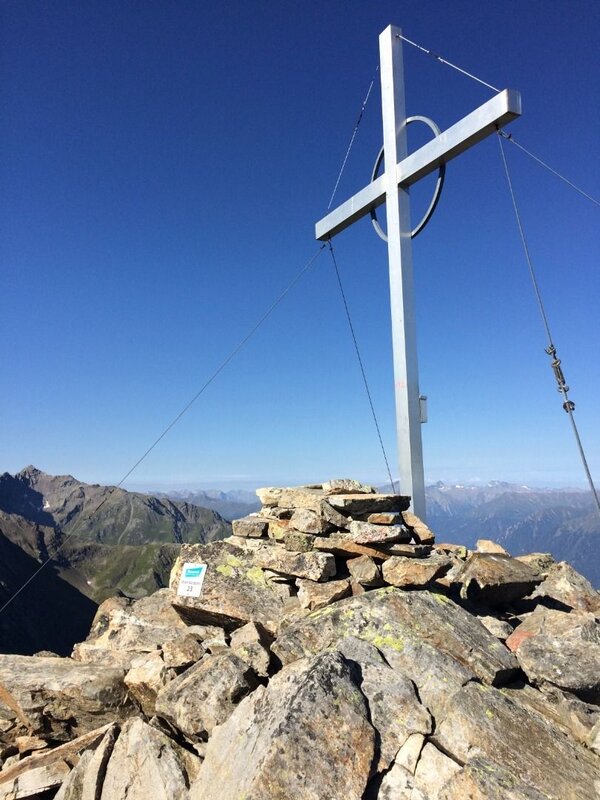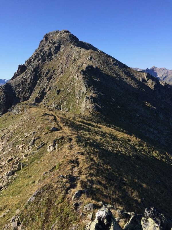 Folgt man den Markierungen nach rechts, erreicht man in einer ansteigenden Querung den Gratrücken zwischen den Gipfeln. Hier wird man von einer beeindruckenden Aussicht auf den gegenüberliegenden Gebirgszug - den Kaunergrat - belohnt.