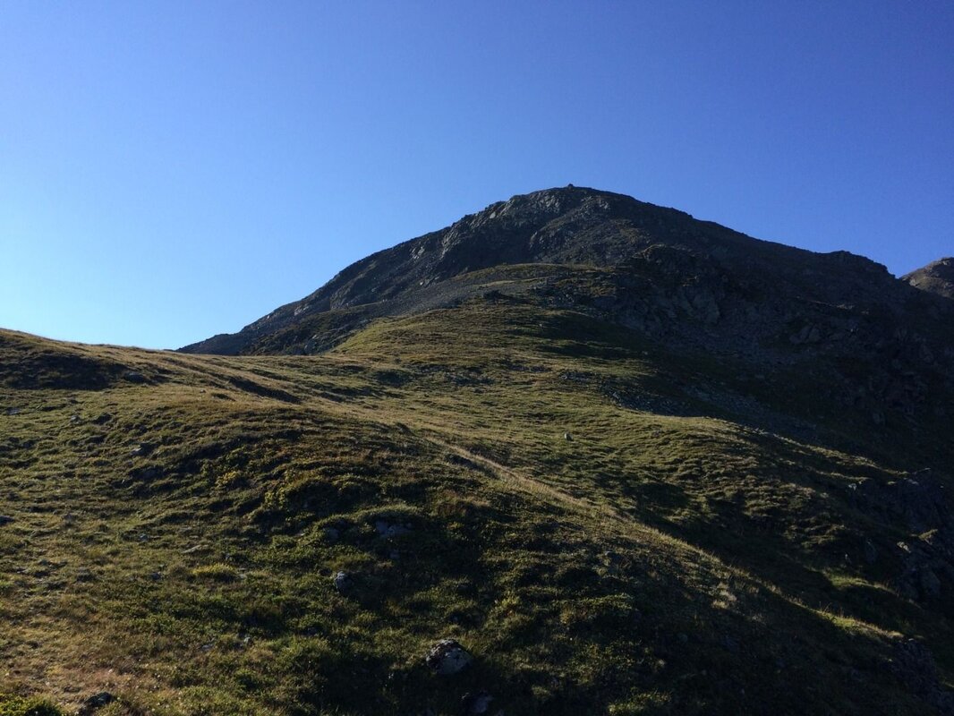 Im weiteren Wegverlauf ist der Gipfel des Mittagskopfs mit seinem Steinmann bereits erkennbar und sogar das Gipfelkreuz des Roten Schrofens leuchtet schon herüber. Das Gelände wird nach den Böden nun wieder steiler.