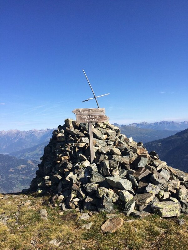 Am Gratrücken folgt man den gut sichtbaren Markierungen weiter in Richtung Süden. Die Wegführung verläuft hier - gut passierbar - an felsigen Passagen mal rechts mal links vorbei, bis zu einem großen Steinmann und von hier aus weiter zum Gipfelkreuz des Roten Schrofens.