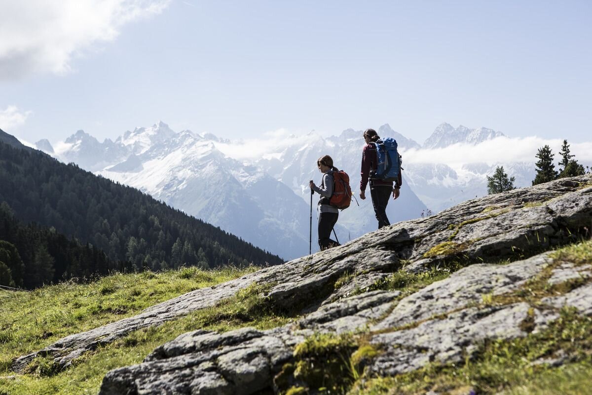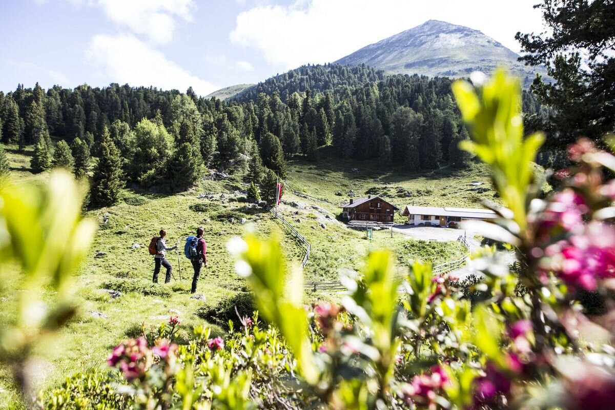 Der Panoramaweg beginnt an der Weidefläche der Aifneralm, führt dann durch einen schönen Bergwald und quert die artenreichen Lawinenbahnen unterhalb der Aifnerspitzen. Nach etwa einer Stunde erreicht man den Anstieg am „Wetterkreuzbichl“ und trifft dort auf eine alte, durch raue Witterung und Blitzschlag gekennzeichnete Lärche. Hier gilt es einige Höhenmeter zu überwinden, wobei der stets gute Steig nun durch schrofferes Gelände führt. Auf einer Seehöhe von 2.220 m gelangt man zum Schlafbödele. Mit beeindruckender Aussicht auf das Kaunertal und den Gepatschferner im Süden wandert man nun bergab. An einer traumhaft gelegenen Bank mit Marterl ist bereits die Hälfte des Weges geschafft. Vorbei an Alpenrosen, Preiselbeeren und einer kleinen, gefassten Quelle führt der Weg weiter in den lichten Lärchenbestand oberhalb der Falkaunsalm. Kurz darauf erreicht man die bewirtschaftete Alm, auf der sich die Zeit bis zur Abholung angenehm verbringen lässt.