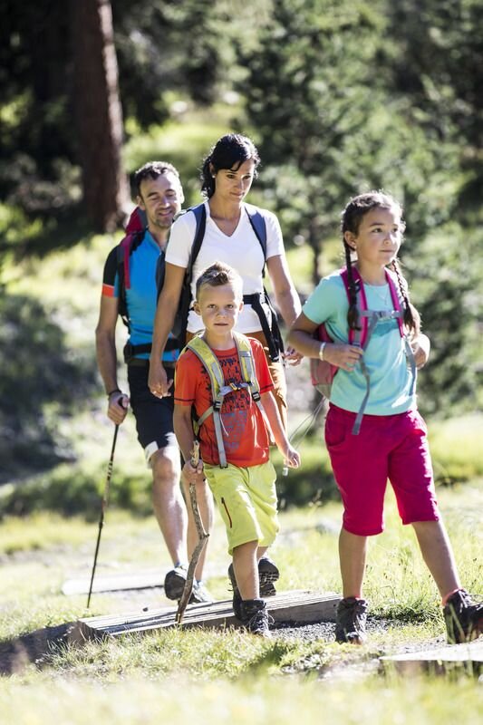 Auffahrt mit der Bergkastelseilbahn. Oben angekommen verläuft der Wanderweg, welcher im Winter die Skipiste bildet, zur Piengalm und weiter zum Bergresort Jochelius.