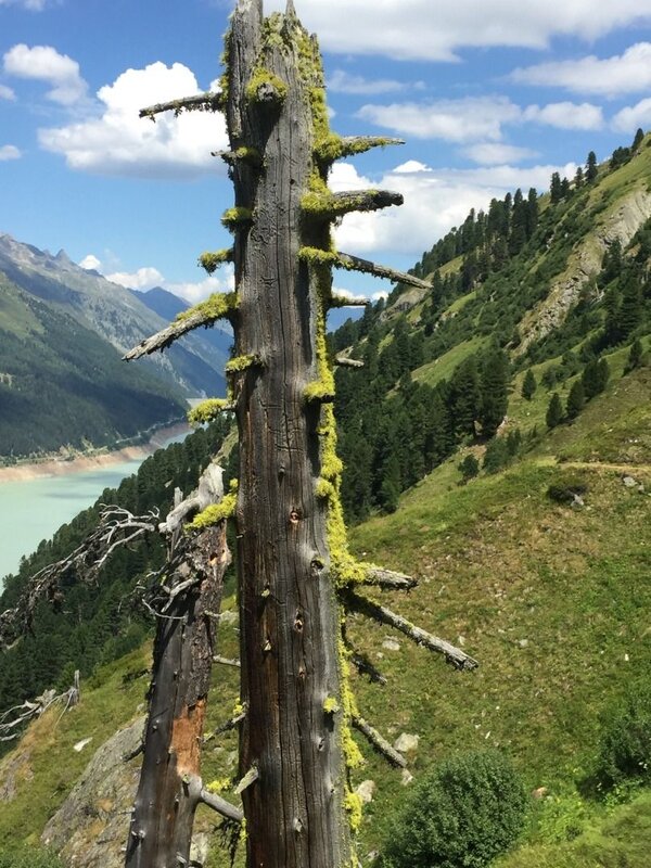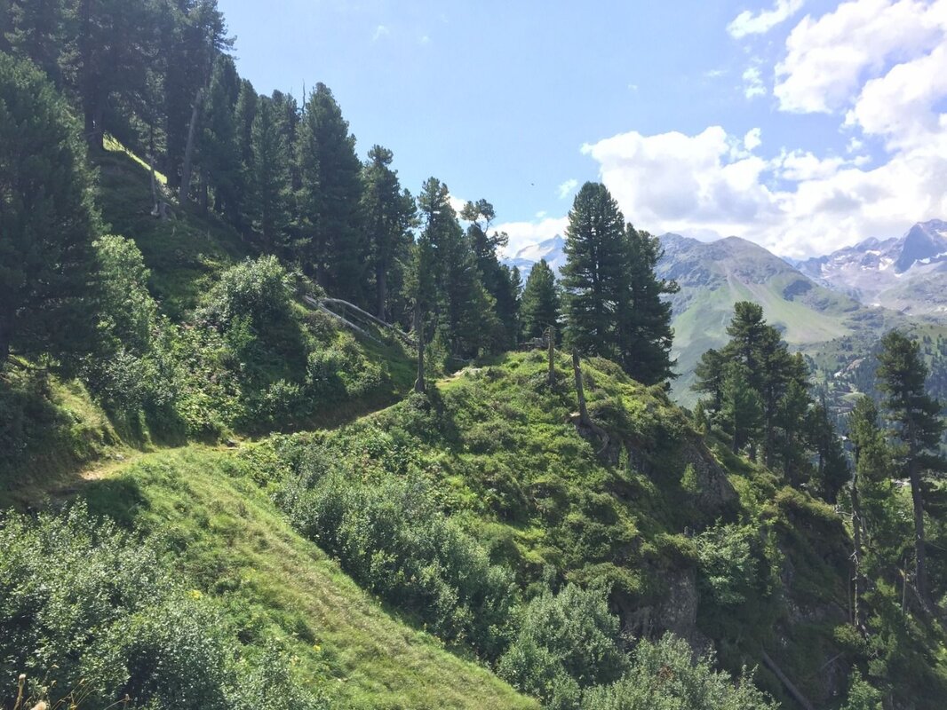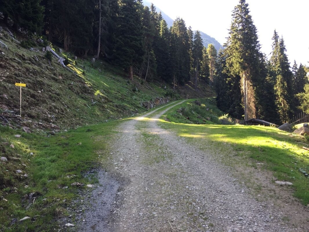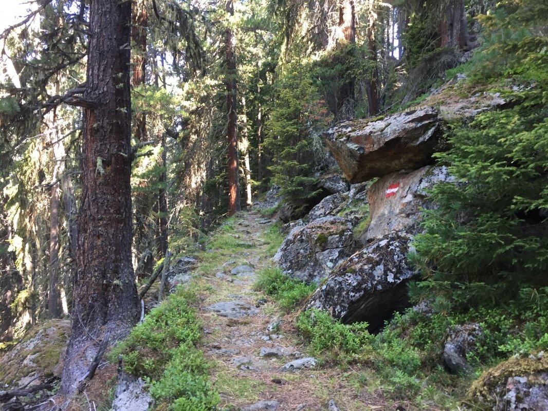 Über einen angenehm angelegten Steig gelangt man durch einen schönen Bergwald, der schließlich - mit der Zirbe als Hauptbaumart - im Bereich der Jägerhütte Hapmes, die Waldgrenze bildet.