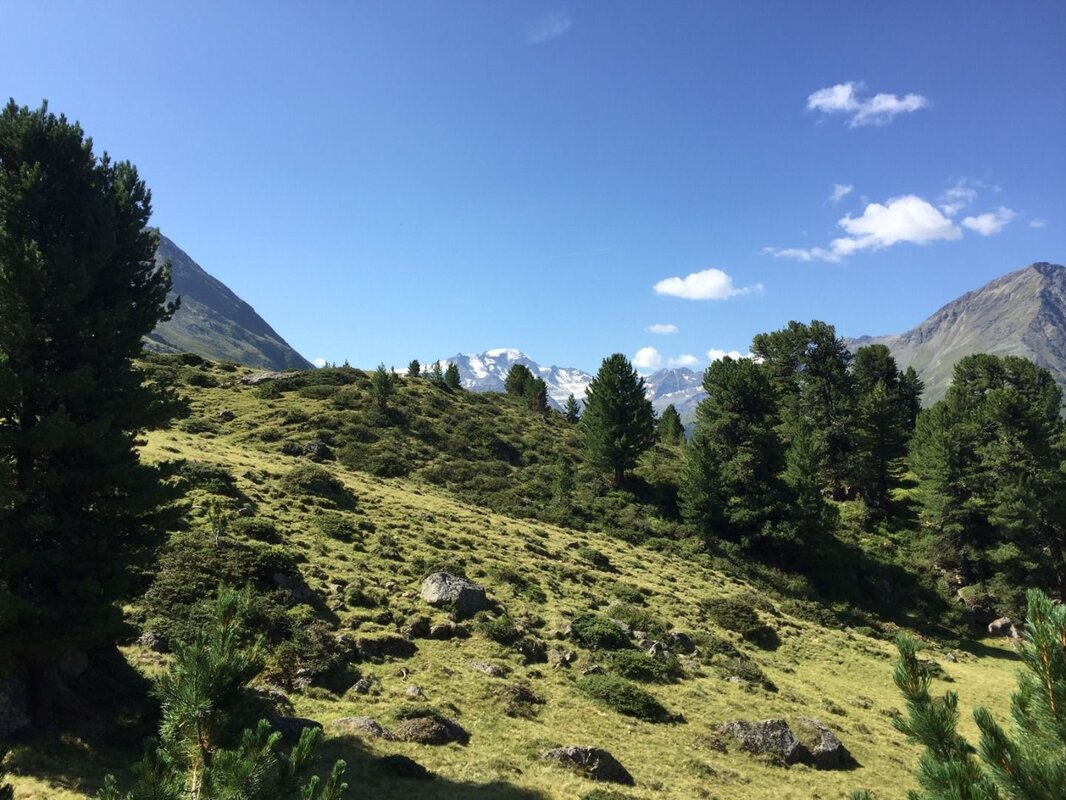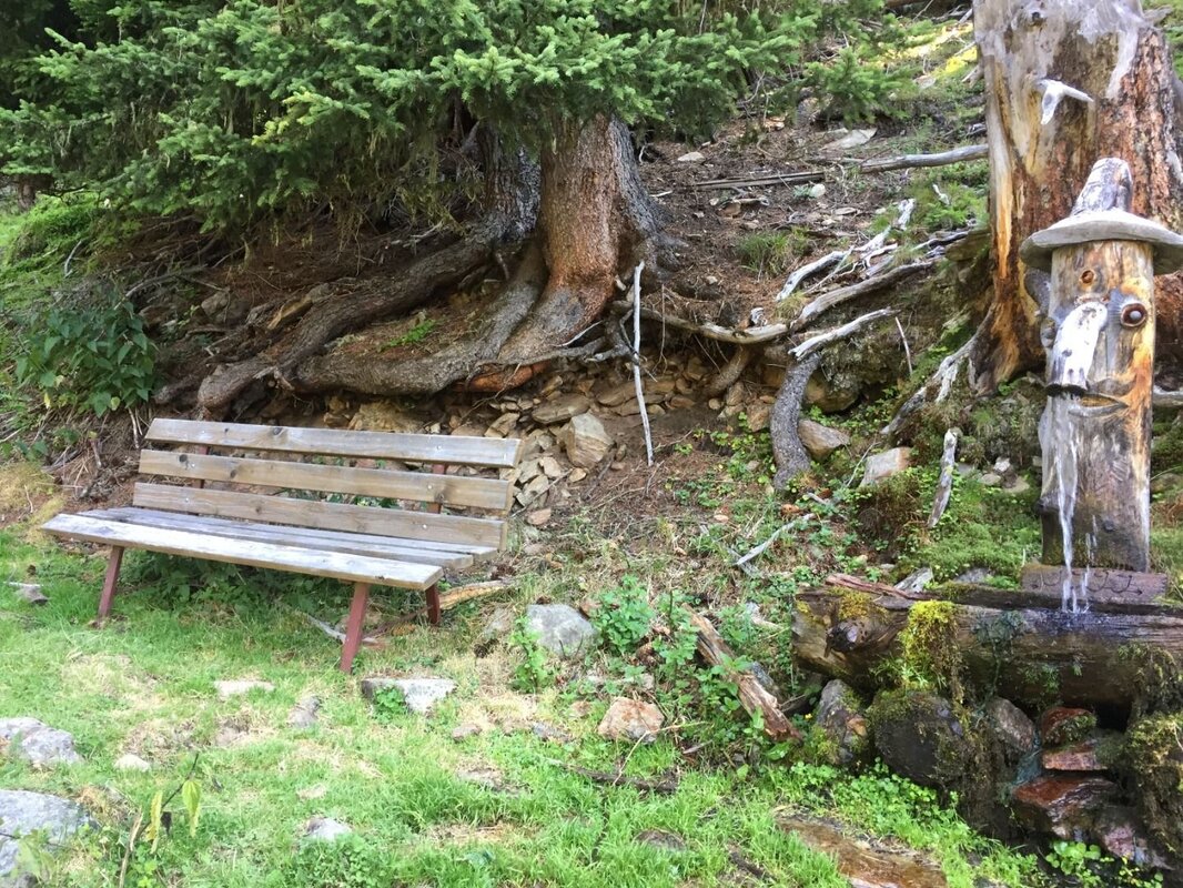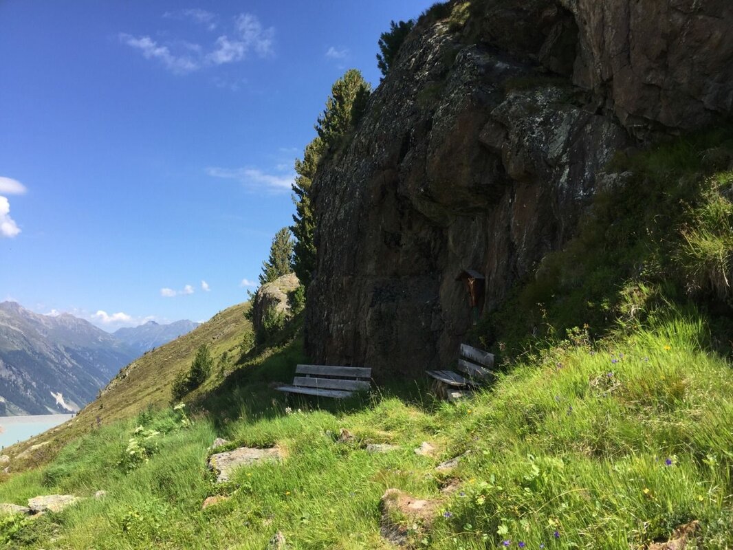Bald darauf kommt man nach Bligg und erreicht dort einen schönen, in einer Felsnische gelegenen Rastplatz. Den Abstieg beginnend, folgt man dem Weg in Richtung Tal, quert den Bligg Bach und gelangt nun wieder in den Waldgrenzbereich mit schönen Zirbelkiefern. Vorbei an steilen Felswänden schlängelt sich der Weg angenehm durch die Landschaft. Bald darauf kann man, auf einer kleinen Kuppe im Wald, bereits den nächsten Rastplatz erkennen. Man folgt dem Weg weiter bergab. Nach einer kurzen, aber steileren Wegpassage, wird der Weg wieder etwas flacher und man gelangt im stetigen Abstieg auf die Gletscherstraße. Dieser folgt man noch wenige Schritte bergauf, dann hat man es geschafft und erreicht das wunderschön gelegene Gepatschhaus.