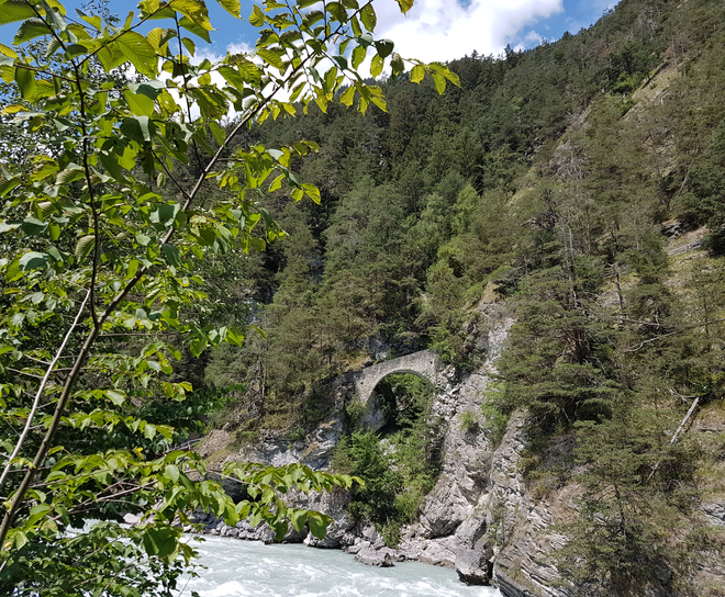 Über diese Brücke führte die einstige schmale Straße nach Serfaus. Es war vielleicht ein Stück der Via Claudia Augusta, die aus der Gegend um Tschupbach über St. Georgen zur Hochfläche von Serfaus, Fiss und Ladis anstieg und von dort wieder nach Pontlatz herabführte.