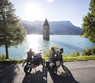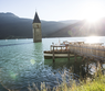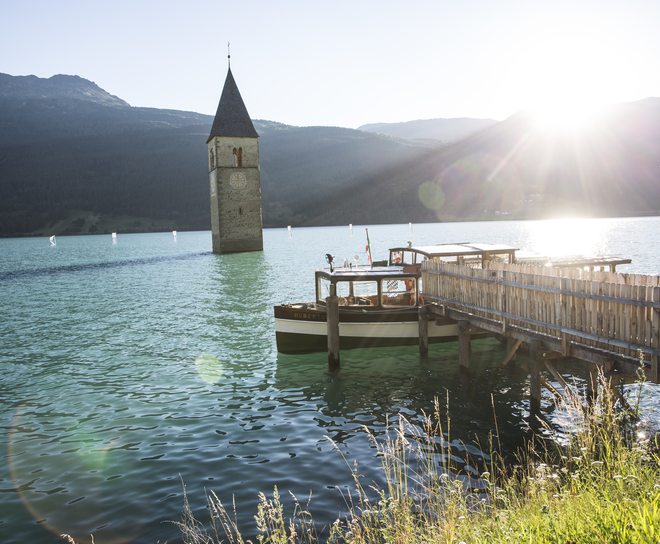 Den Kirchturm, der direkt aus dem Wasser des Reschensees im nahegelegenen Italien ragt, muss man gesehen haben. Eine bewegende Geschichte birgt der Stausee, der auch zum Wassersport einlädt.