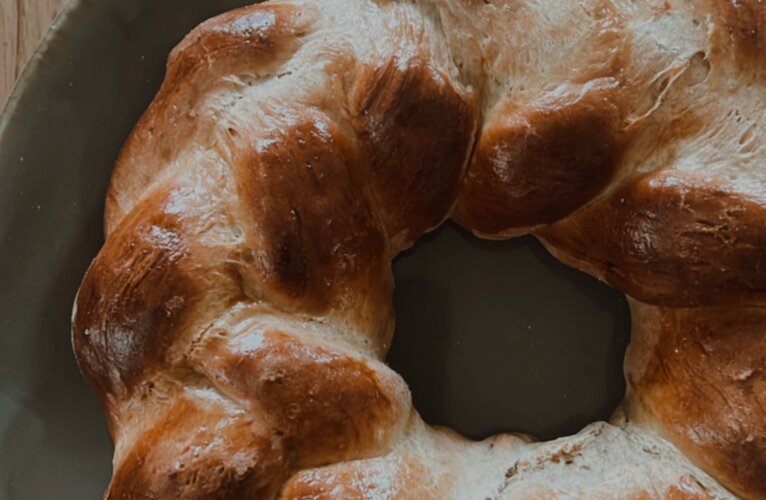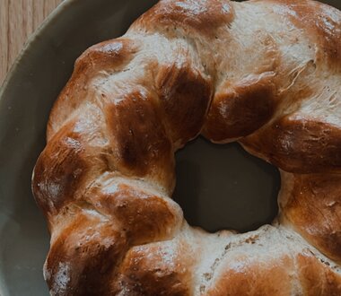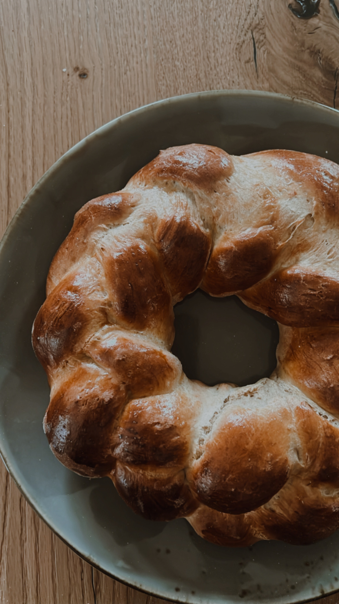 - Teig anschließend auf eine bemehlte Arbeitsfläche geben und in drei Teile teilen. Die Teigstücke jeweils zu langen Rollen formen und zu einem Zopf flechten. Du kannst den Zopf entweder rund zu einem Kranz formen oder einfach als gerade „Stränge“. Die Enden miteinander verdrehen und unter den Zopf legen, damit sie einen schönen Abschluss bilden.
