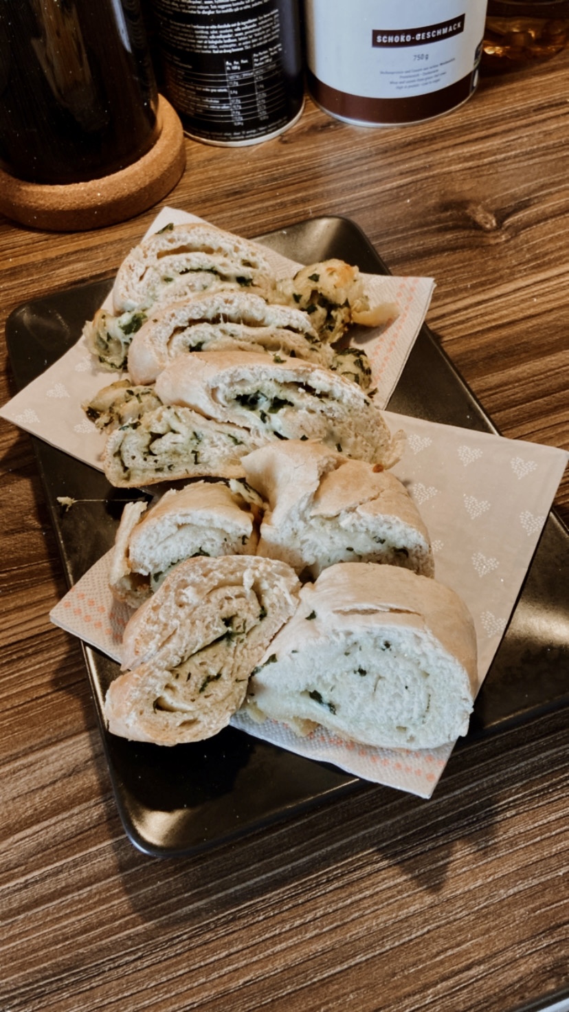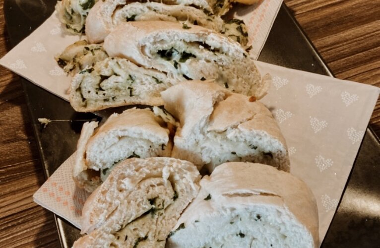 - Anschließend den Teig auf einer bemehlten Arbeitsfläche halbieren, jeweils zu einem Rechteck ausrollen, mit Bärlauchbutter bestreichen und mit Mozzarella bestreuen. Anschließend den Teig von der langen Seite aufrollen. Die Teigrolle längs halbieren und die beiden Teigstränge anschließend umeinanderwickeln.