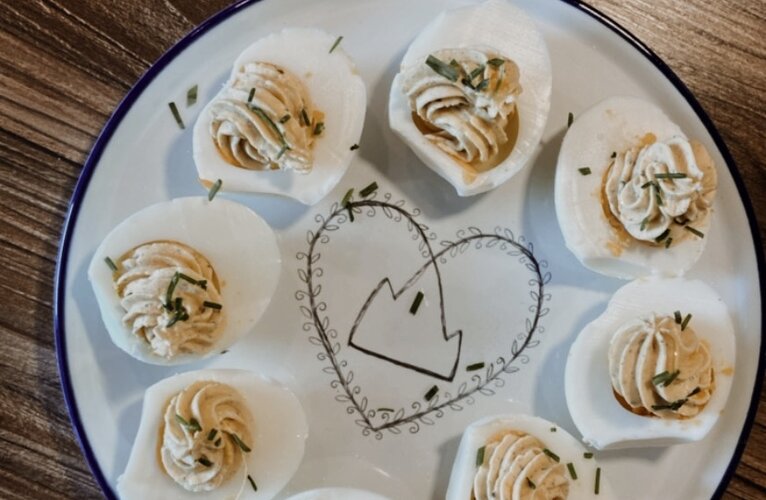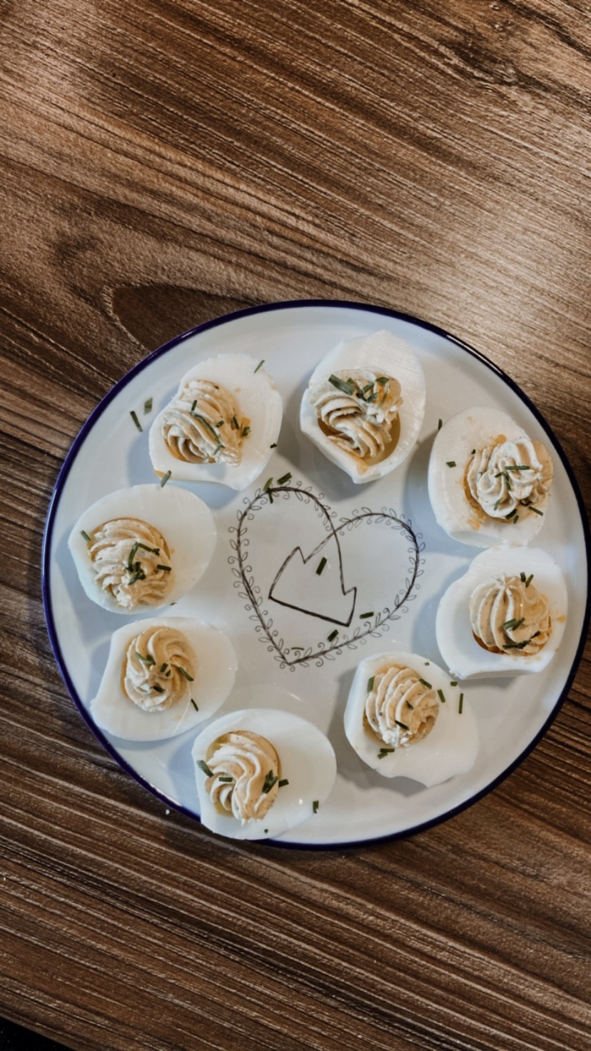- Anschließend Eier halbieren, das Eigelb herauskratzen und mit den restlichen Zutaten pürieren.