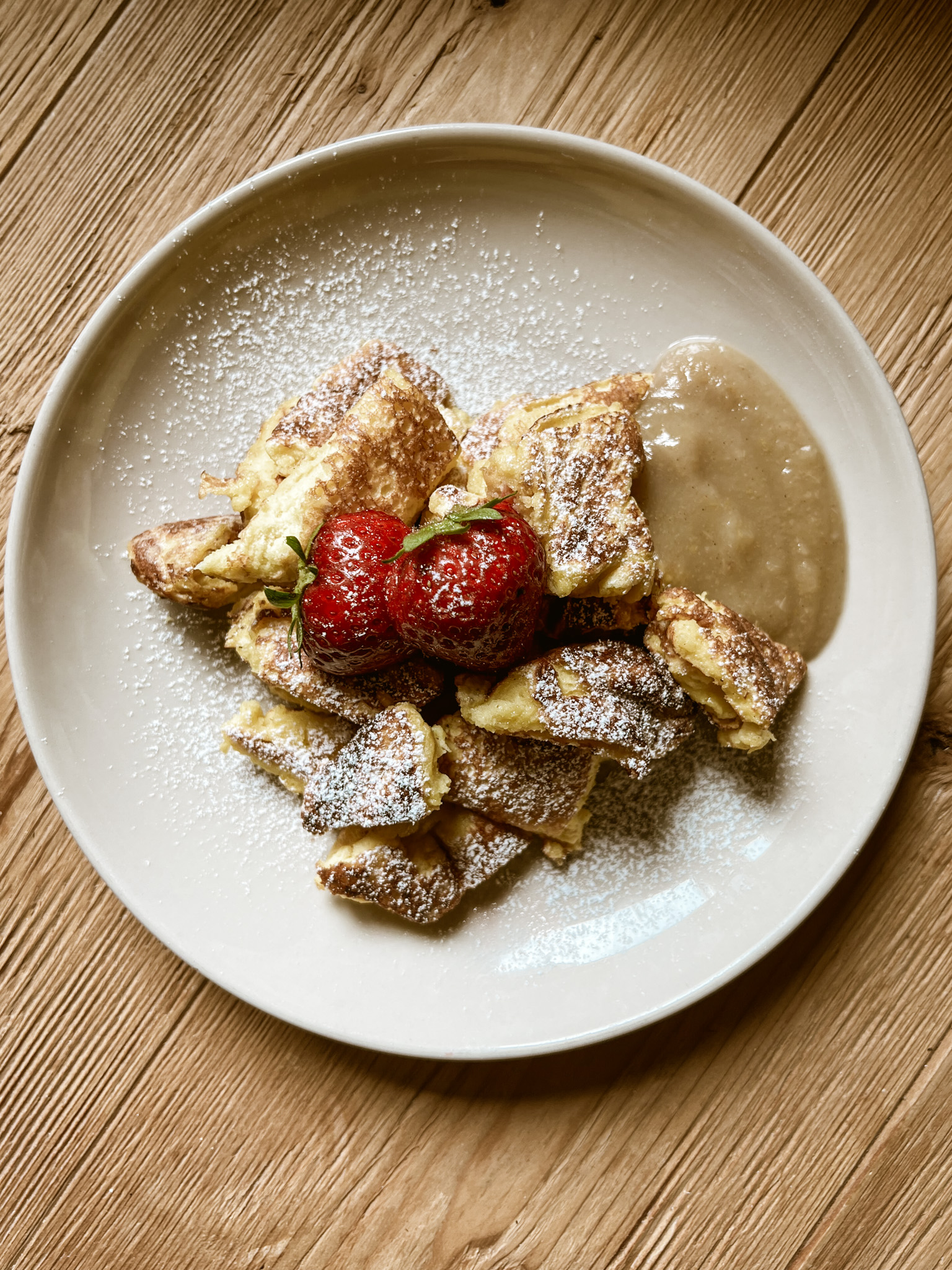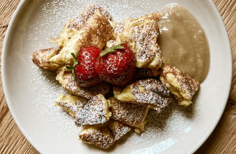 🧡 Zum Kaiserschmarren kann man klassisch wilde Preiselbeermarmelade oder frisches Apfelmus servieren. Alternativ kann je nach Saison auch ein frisches Erdbeer-Rhabarber Kompott oder ein klassischer Zwetschkenröster dazu gereicht werden.
