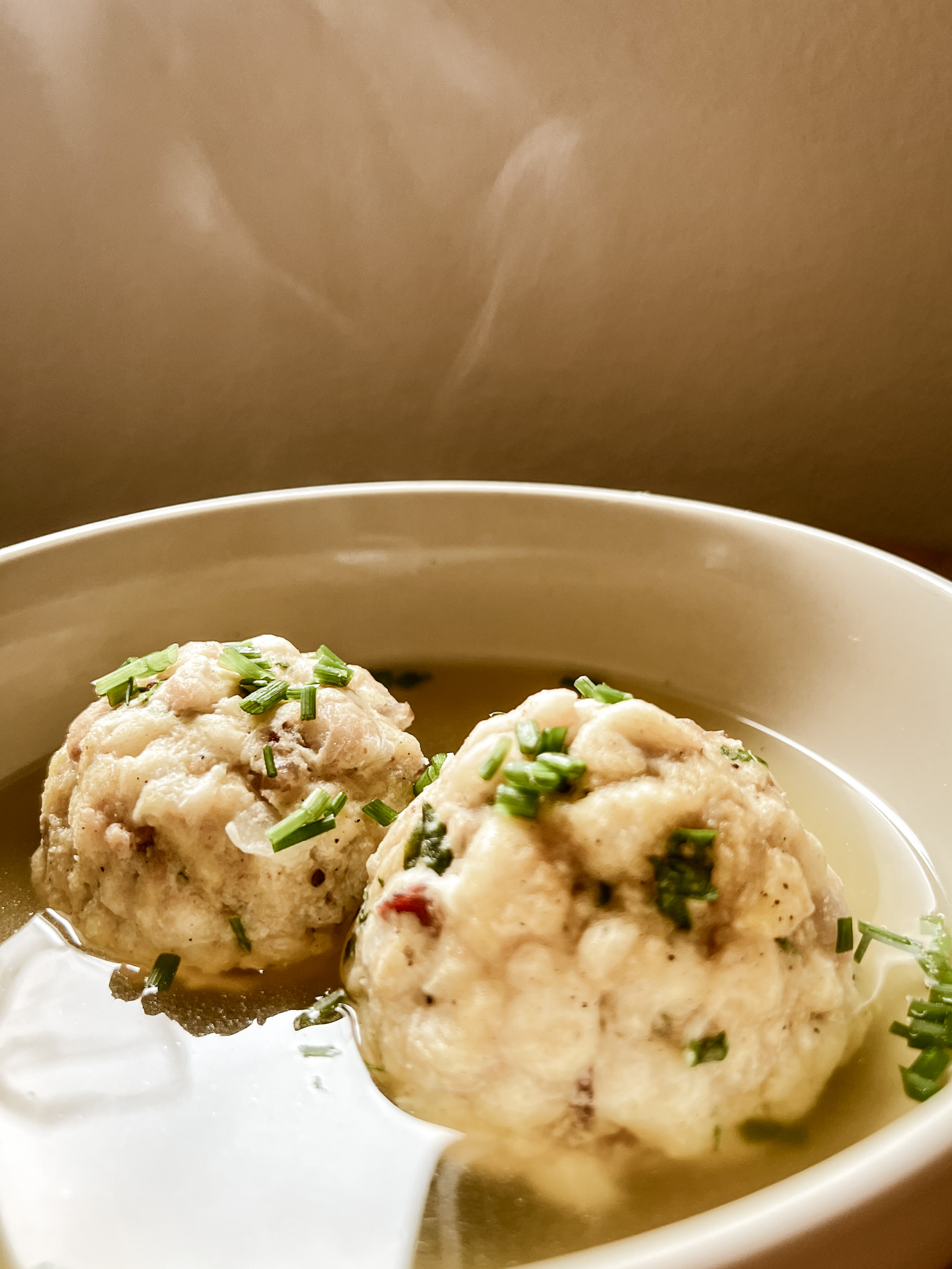 🧡 Die Knödel entweder mit klarer Rindssuppe, Sauerkraut, oder einer Gemüsebeilage nach Wunsch servieren.