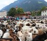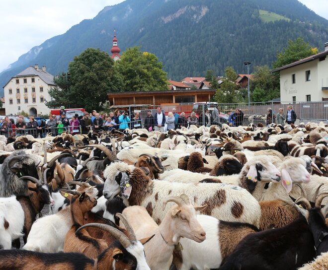 About 600 mountain sheep are driven from the alpine pastures down to the village. At the Ensplatz the splitting of the animals begins. The sheep are returned to their owners and sheared.