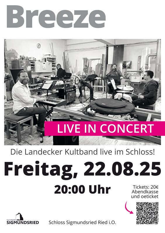 The Landeck band “Breeze,” founded in 1995, is performing at Sigmundsried Castle for the first time. Without wanting to deprive the audience of their old “classics” from their three previously released studio albums, the four musicians have also developed new material. All songs are written, composed, and arranged by the band themselves.