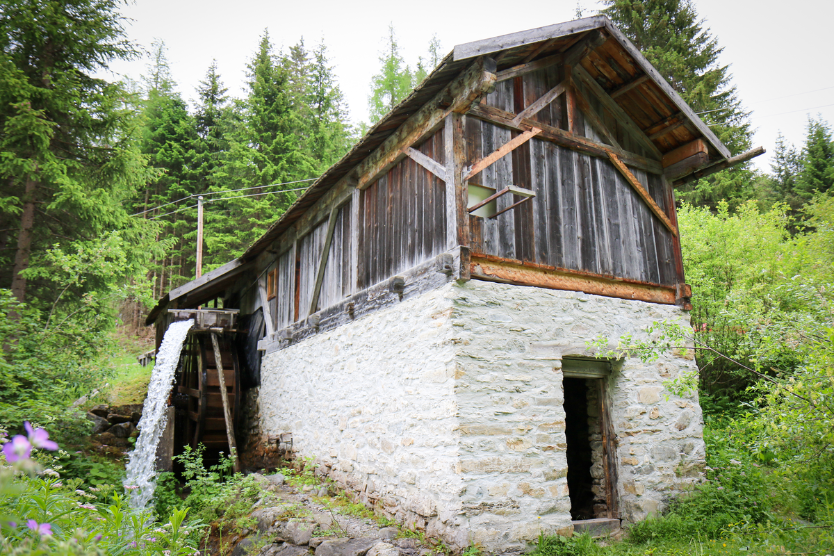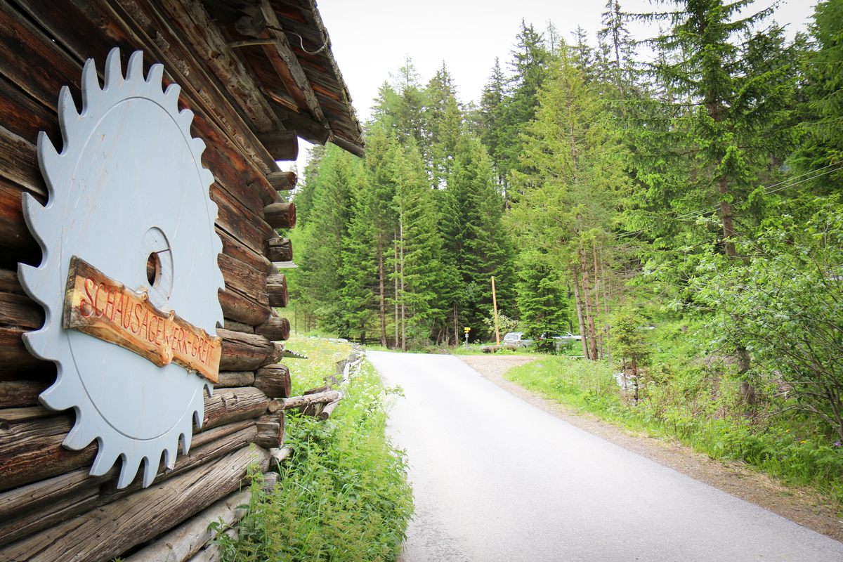 The stele at the Greiter Säge tells of the history and function of the sawmill, of its construction by the Federal Forests, its takeover by the Greiter farmers, its decay and renovation, and the importance of using and processing wood with the power of water.