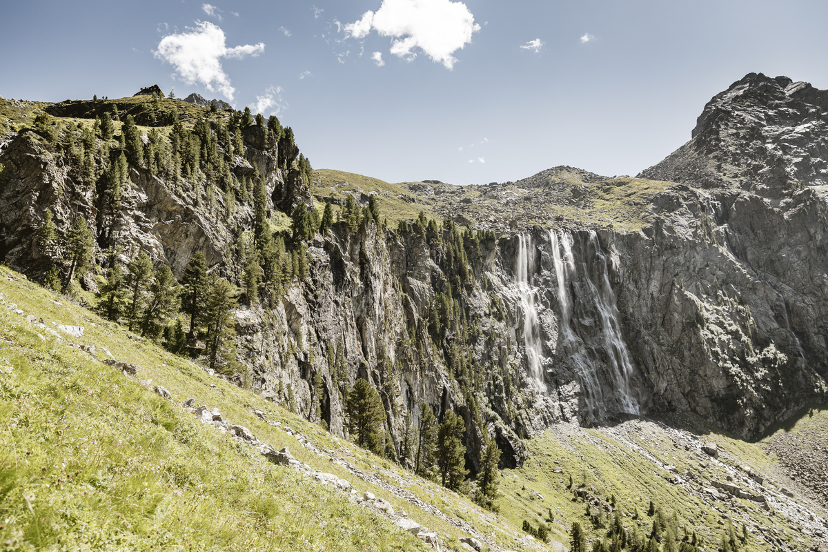 The Anton Renk hut is a non-managed refuge of the German Alpine Club. The Anton Renk hut is embedded in the Glockturmkamm (Ötztal Alps) and is surrounded by the mountain peaks Feichtner Karlsspitze, Old Man, Pfroslkopf, Zirmesspitze and Kuppkarlesspitze. The hut is particularly impressive because of the waterfall that falls only a few meters away (Fallender Bach, damp wall), which reaches a height of around 170 meters.