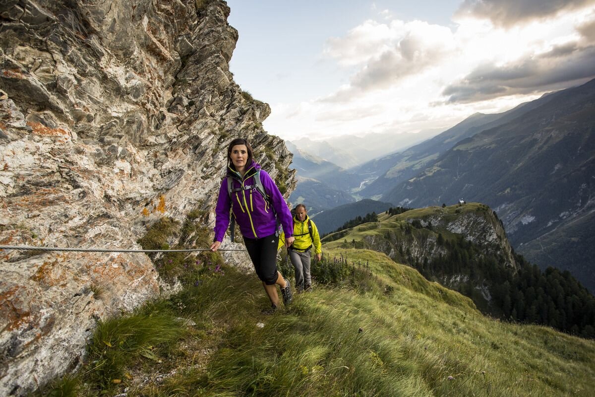 For many, edelweiss is the epitome of the Alps, for others a legendary mystery. The Edelweisssteig, with the sign of the royal alpine flower, leads experienced mountaineers from the Bazahler Kopf (2,160 m) to the Fluchtwand and promises an impressive mountain panorama.  Starting from the parish church in the centre of Nauders, Trail no. 14 leads towards Parditschhof. From there it goes on Route no. 16 through the Valdigastei, past the Bazahler peaks, to the entrance of the Edelweisssteig (No. 15 b) at approx. 2,200 m. The trail marked black is only suitable for experienced mountain hikers. It is secured with a steel cable and stirrups and leads over the edge of the mountain up to the Fluchtwand at 2,328 m. A head for heights and being sure-footed are essential. A simpler alternative is the red (intermediate) Mountain trail no. 15a. The way back is via Trail no. 15 to Labaunalm and past the Parditschhof back to Nauders (No. 14 or 14a).