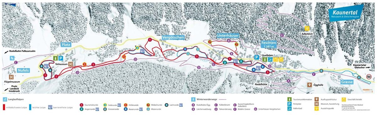 This cross-country ski trail is located in the Unterhäuser district. The trail is ideal for beginners. It is used by many cross-country skiers as a shortcut to the large Kaunertal circuit. However, it is also nice to run as a loop in its own right, as it includes everything ... from ascents and descents to long flat sections.