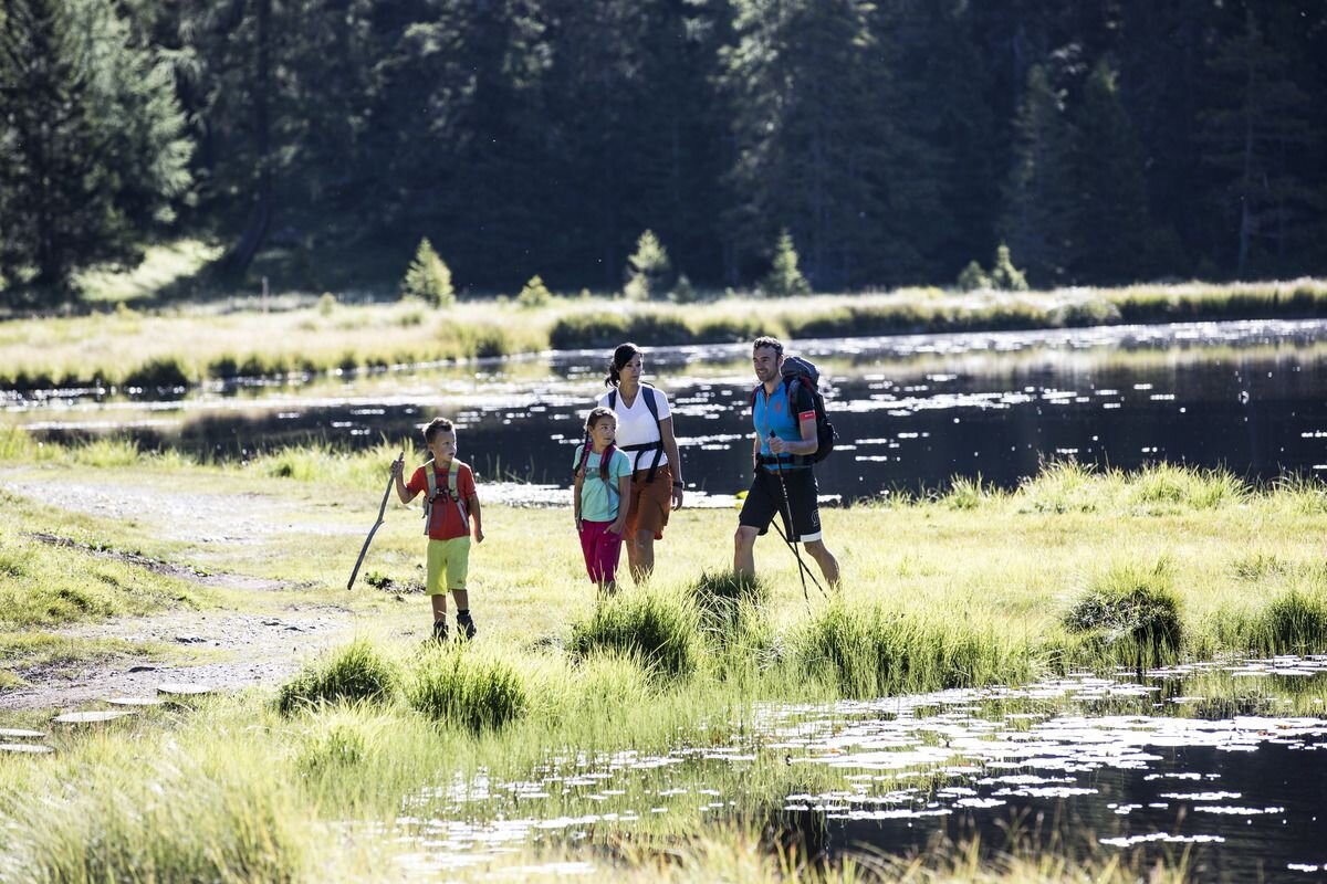 With the Mutzkopf chairlift you first drive up to the Kleiner Mutzkopf (1,812 m). From the mountain station, Route no. 9 leads slightly down through the forest to the Schwarzer See. The route continues on Trail no. 6a to the Grüner See. The nature-protected mountain lake is relatively warm and is ideal for a swim in the summer. Further south-east you can reach the Grossmutz meadows and the turn-off to the Grossmutz peak via a short, steep climb. From here the route goes on Trail no. 6 over the Partoang meadows. Short steep sections and flat meadows lead to the highest point of the Grosser Mutzkopf (1,987 m) with a beautiful view of Lake Reschen and the Ortler Group. On the way back, follow Trail no. 7, past the Tief and Riatschhof, and over a ski path (No. 5a) to the valley meadows to Nauders.