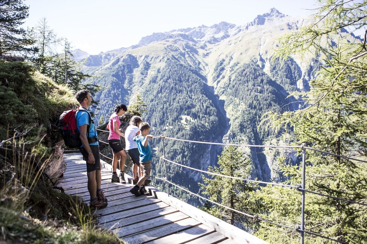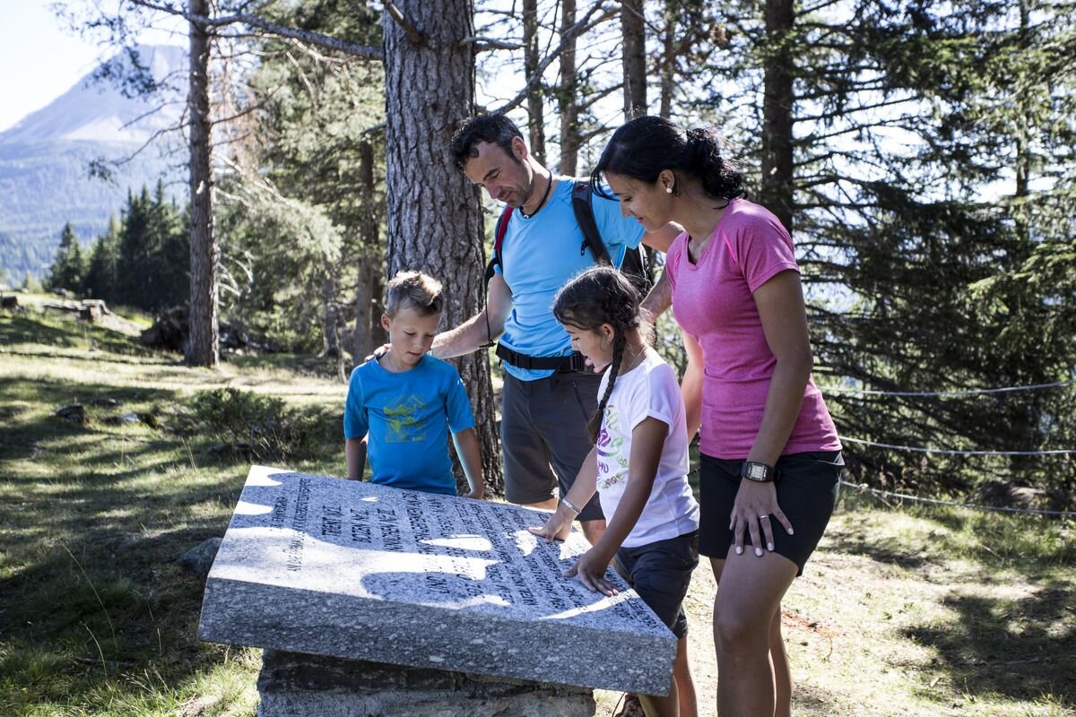 Hiking trail no. 1 starts in Lochmühle. After a few hundred metres, follow Trail no. 2 towards Sellesköpfe. Over a short flat section and through the larch forest the route goes up to the municipal pastures and on to the pastures on Selles. Now a short pass leads in a northeasterly direction to Finstermünz and Bergkastelblick (1,586 m). From here back to the signpost. After a few hairpin bends you reach the highest point of the Sellesköpfe (1,646 m). Now the route goes back over the Langen Boden, past the Zettler Alm and the still very visible positions and rock caverns from the First World War. The marked trail continues down through the forest towards the Schöpfwarte and Norbertshöhe (refreshments available). From there via Hiking trail no. 1 back to Nauders.